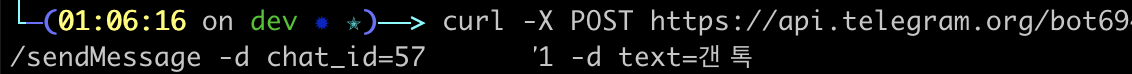 sendMessage API로 chat_id와 text 파라미터를 채워서 보내봅니다.